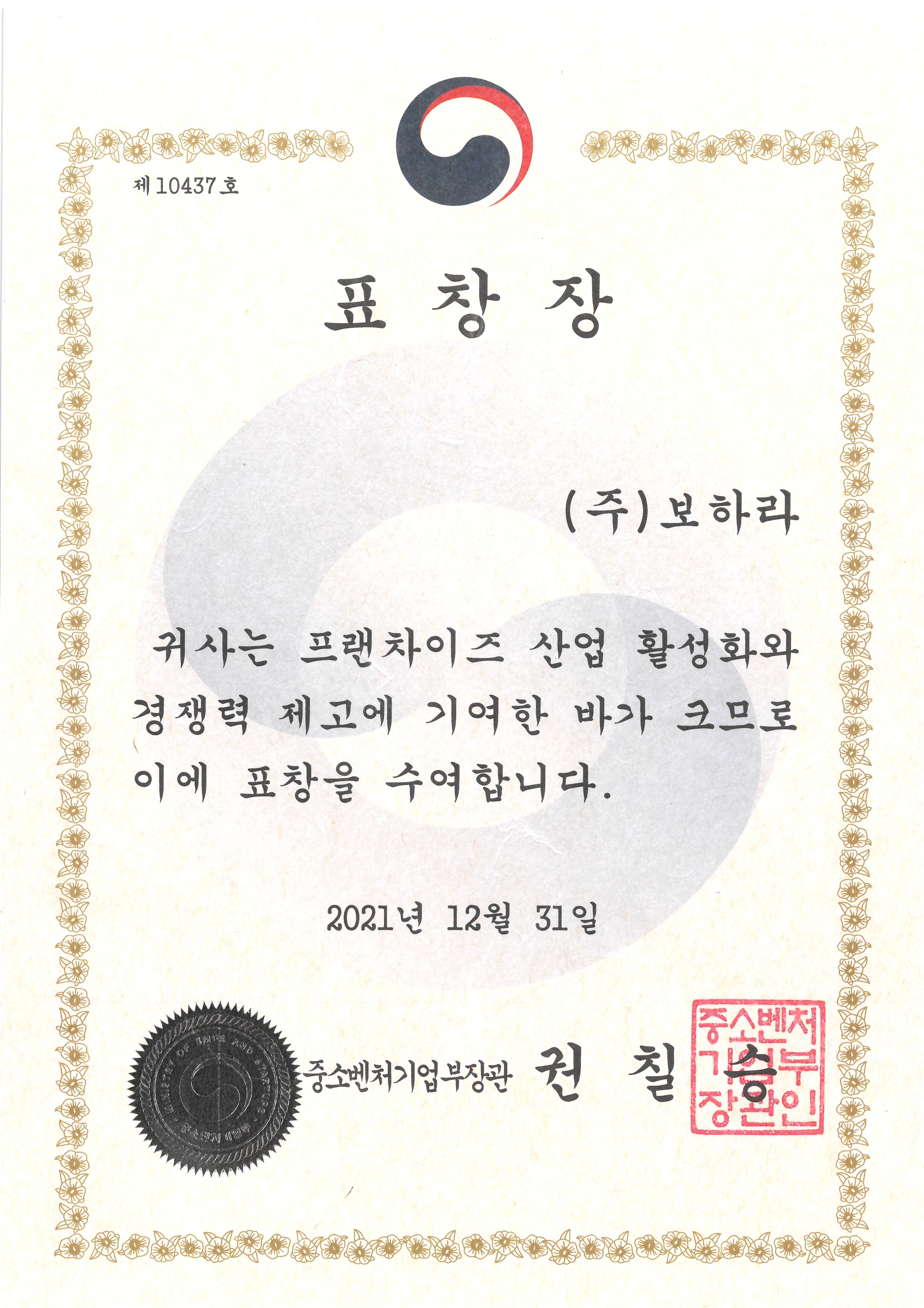 [소식] 남다른감자탕 '2021 상생 협력 프랜차이즈 우수 선정' 중소벤처기업부 장관 표창 수상